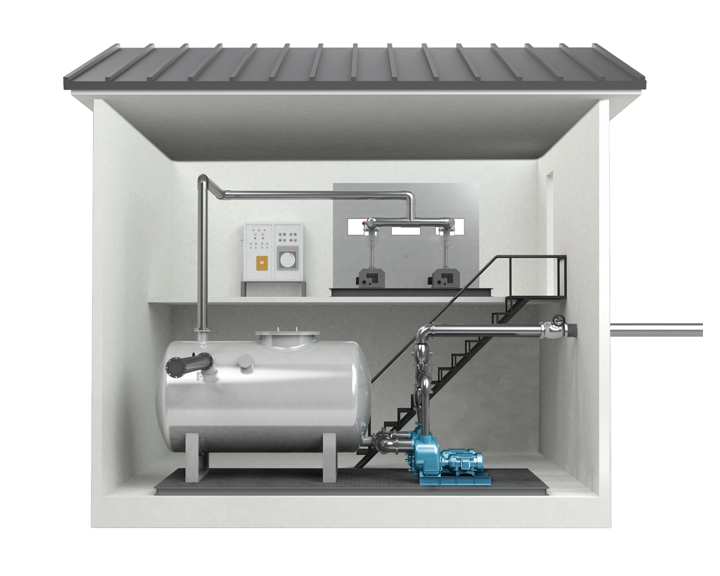 The central vacuum station is the heart of every vacuum network. Its main components are the wastewater collection tank, the wastewater discharge pumps and, of course, the vacuum pumps. They generate the required vacuum in the system – approximately -0.6 bar. Roediger® vacuum transfer stations are available in all conceivable sizes – from standardized compact systems for a few users to customized large-scale systems serving several thousand residential units.